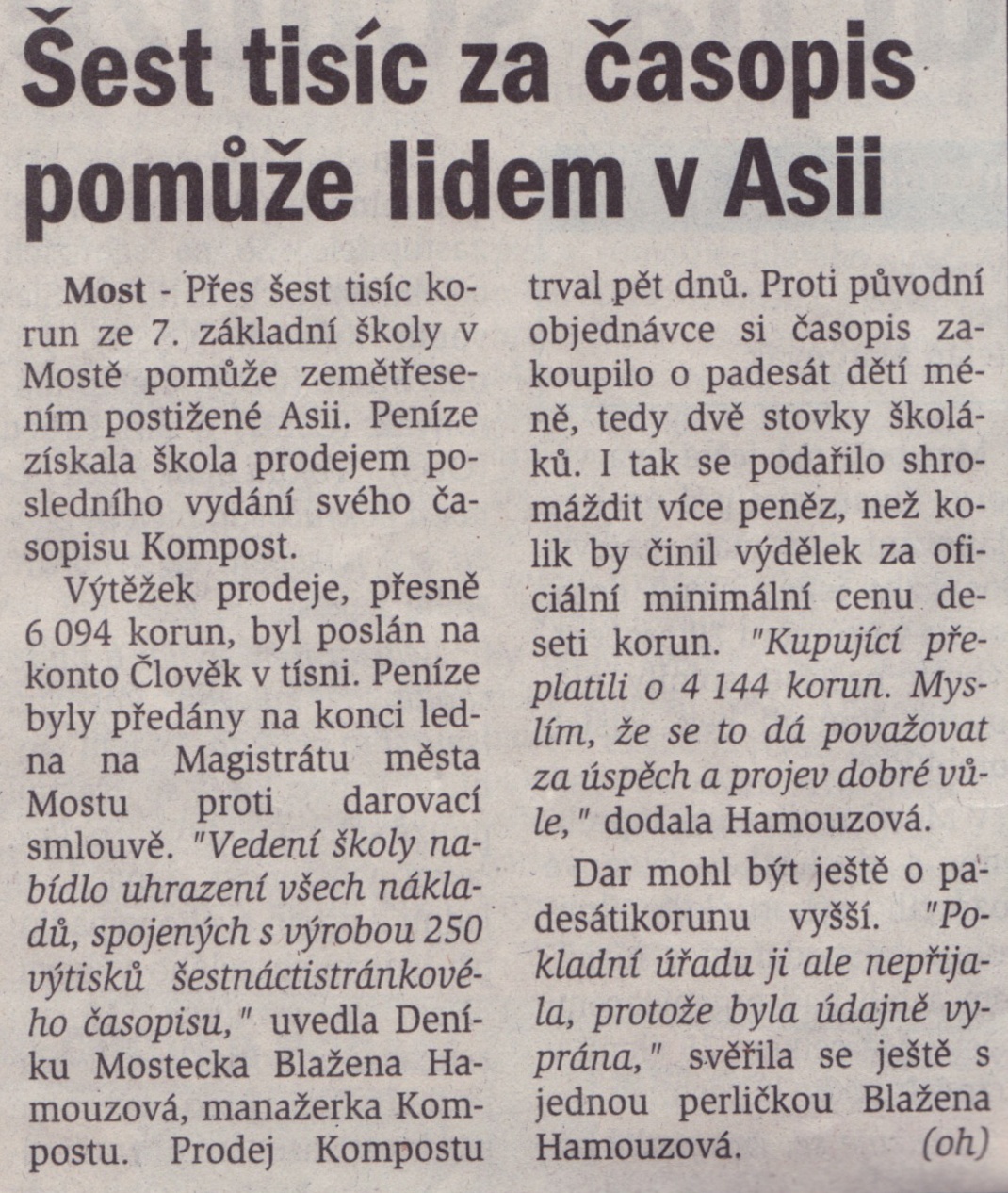 Vybafnete-li na dospělé absolventy 10. ZŠ anebo 7. ZŠ v Mostě, kteří TO zažili, slovo „KOMPOST“, na zahrádku si asi nevzpomenou. Spíše se jim vybaví časopis, který schovávali při vyučování pod lavicí.
